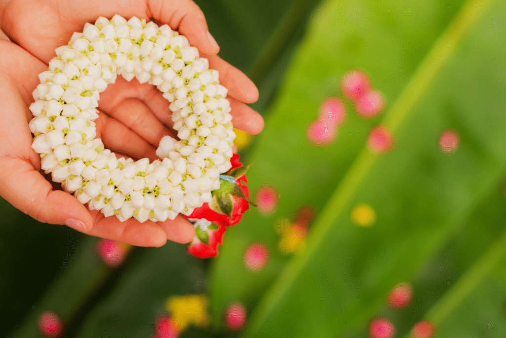 You will rarely see an Indian wedding without the Mogra flower. It is used in garlands, bridal hair decorations, and wedding hall arrangements. The strong and beautiful scent of Mogra sets a romantic mood at weddings. In many traditions, the bride decorates her hair with a string of Mogra flowers, which is called a “Gajra.” This is one of the most iconic images of Indian bridal beauty.